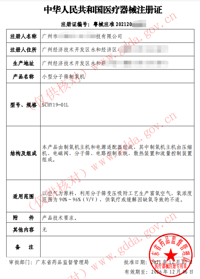 小型分子篩制氧機(jī)注冊證